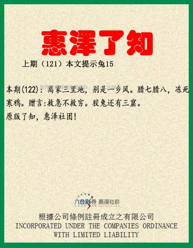 【惠泽了知】122期:离家三里地,别是一乡风。解家肖牛马羊鸡狗猪。腊七腊八,冻死寒鸦。解冬肖鼠猪牛。贈言:救急不救穷。狡兔还有三窟。