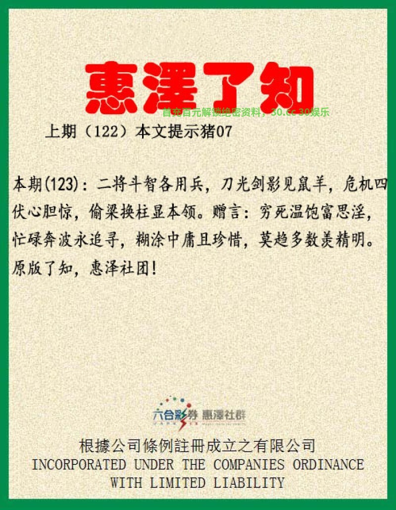 【惠泽了知】123期:二将斗智各用兵,刀光剑影见鼠羊,解明肖鼠羊。危机四伏心胆惊,偷梁换柱显本领。解凶肖鼠牛虎猴狗猪。赠言:穷死温饱富思淫,忙碌奔波永追寻,糊涂中庸且珍惜,莫趋多数羡精明。