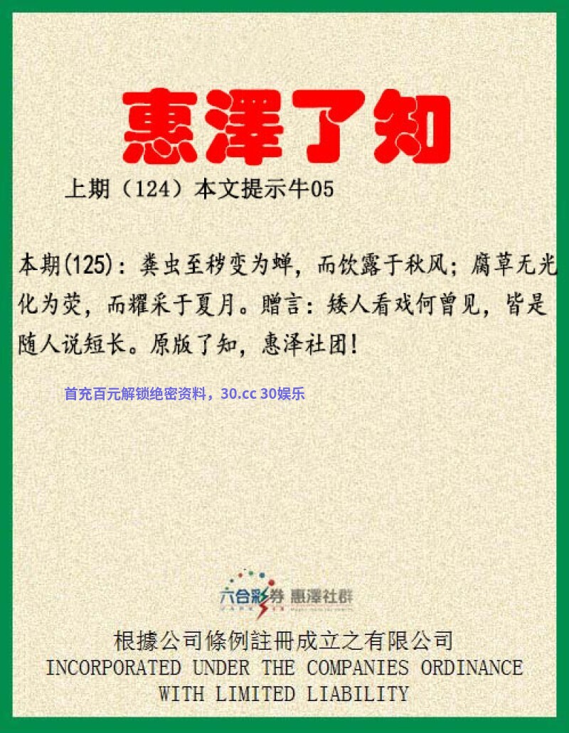 【惠泽了知】113期:小处不渗漏,暗处不欺隐,末路不怠荒,才是真正英雄。贈言:见贫休笑富休夸,谁是常贫久富家。诗文意思为:细微之处不可粗心大意疏忽遗漏,在没人见的地方不能做见不得人的事,即使处于穷途末路的时候也振作精神、奋发向上,这才是真正的英雄好汉。小处解小肖:鼠兔龙蛇猴鸡。暗处解阴肖:鼠龙马蛇狗猪。